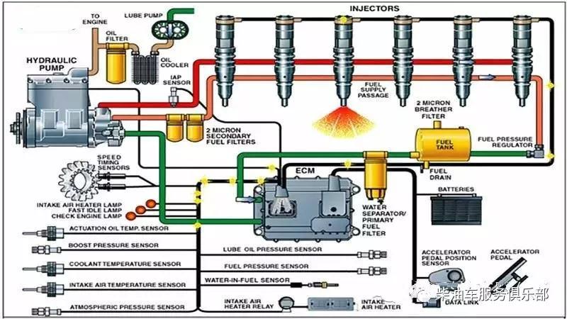 The HEUI fuel system is mainly composed of fuel delivery pump, first and second class fuel filter, fuel pressure regulating valve, hydraulic drive electronic control unit injection pump, hydraulic oil supply pump, hydraulic oil line, electronic control unit and Fuel return pipe, hydraulic oil pipe and other components, in addition, hydraulic oil pressure sensor, hydraulic oil temperature sensor, fuel temperature sensor, throttle position sensor, fuel pump control valve signal sensor, etc. are also used in the system.