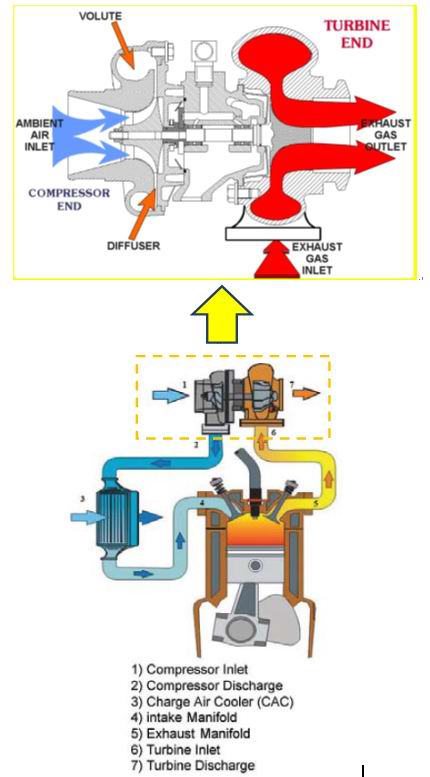 - A pressure and temperature drop occurs (expansion) across the turbine [7], which harnesses the energy of the exhaust gas to provide the power necessary to drive the compressor.